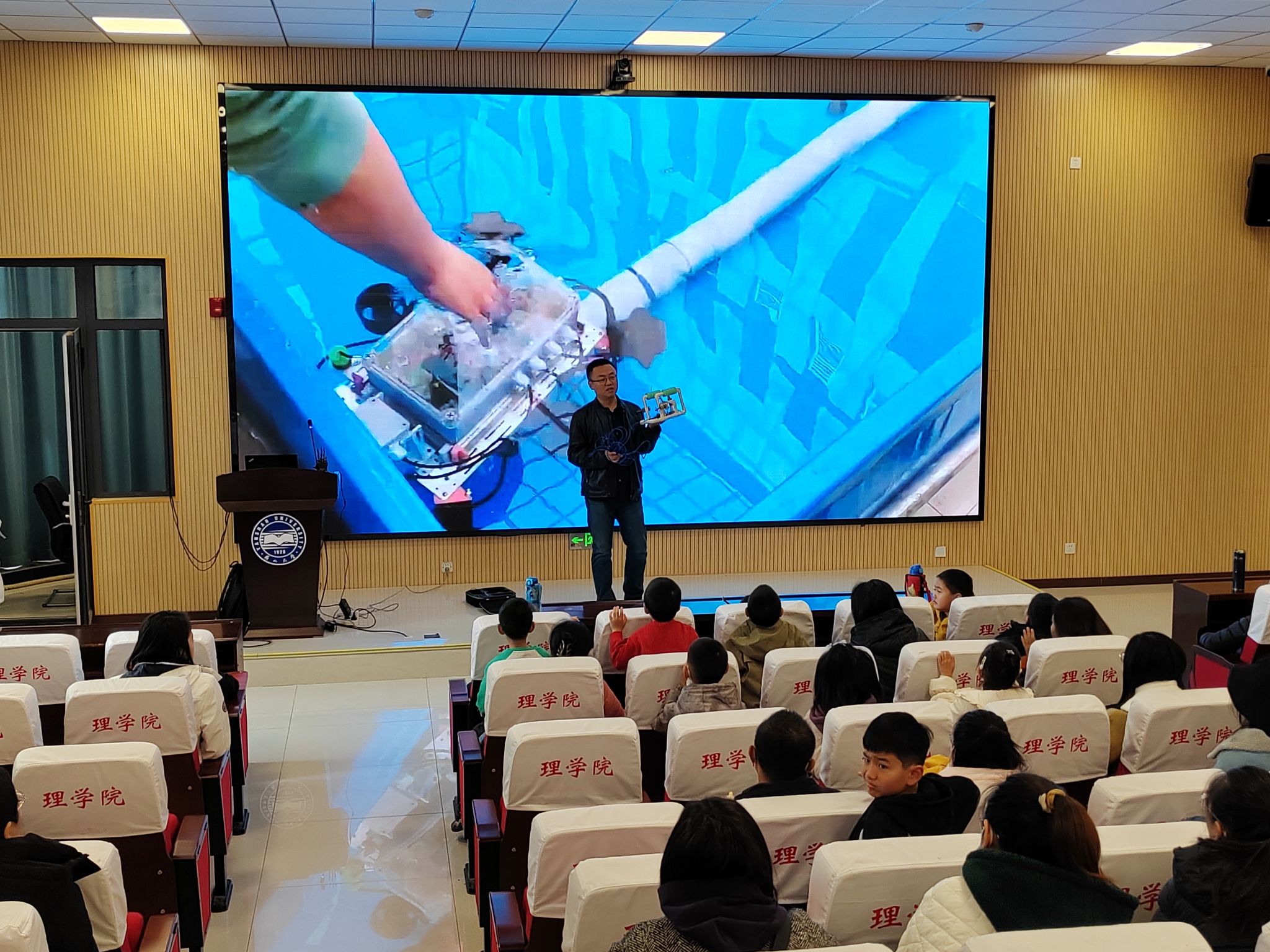 活动现场分为科普讲座和动手实践两大环节。在科普讲座上,科普老师借助动画演示和实物拆解,生动地为家长与孩子揭开了水下机器人的奥秘。孩子们目不转睛地看着螺旋桨如何在水中产生推力、声呐怎样探测障碍物以及摄像头如何传回实时画面,眼中满是好奇与惊叹。