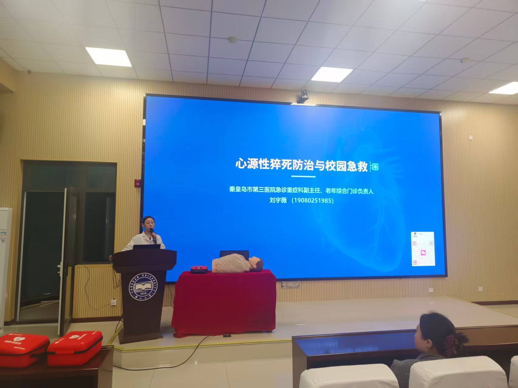 为切实提升教职工的急救意识与应急处置能力,筑牢校园健康安全防线,3月26日下午,理学院在理学楼C107精心组织举办了“心源性猝死防治与校园急救”专题讲座。本次讲座特别邀请到秦皇岛市第三医院刘宇薇主任担任主讲嘉宾,学院师生齐聚现场,共同开启了一场兼具专业性与实用性的急救知识学习之旅。
