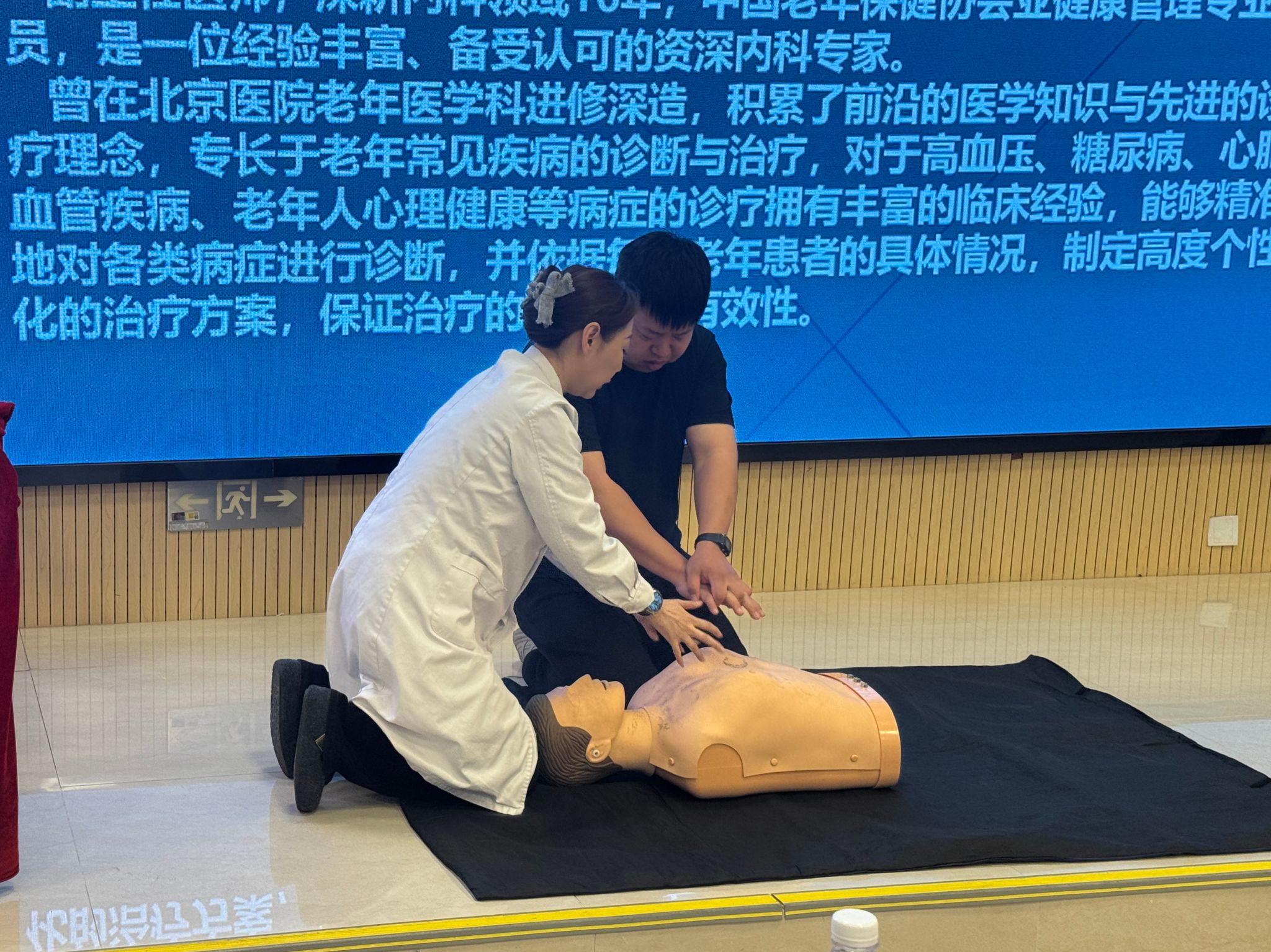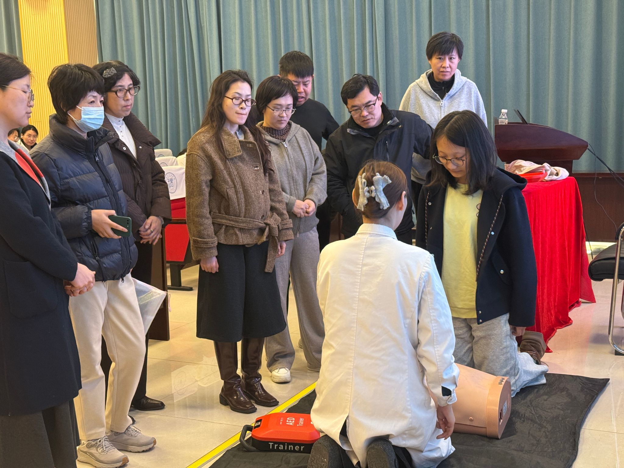 应急处置是本次讲座的核心环节。刘主任围绕心肺复苏标准流程展开系统教学,从判断现场环境安全、检查患者意识与呼吸,到胸外按压的部位、频率、深度,再到开放气道、人工呼吸的操作规范,每一个步骤都进行了细致拆解与示范。为了让教职工真正掌握实操技能,刘主任还带来了AED教学机,现场演示设备的操作流程,包括开机、贴片、除颤等关键步骤,并邀请教职工上台实践操作,亲自指导纠正动作偏差,确保每位参与者都能熟练掌握AED机的正确使用方法。