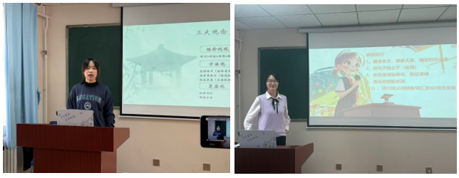 分享会上,姚晨悦就考试的重要性概述、考试基本介绍、各题型解题技巧以及系统备考方法建议进行了分享,并嘱咐同学们要巩固语法知识、强化真题训练、做好模拟测试、进行查漏补缺,全面提高个人应试能力。随后,陈梓怡从题型概述、翻译技巧、写作提升、单词积累四个方面进行了分享。在题型概述方面,从考试的流程、题型的分数构成进行了讲述。在翻译技巧方面,着重讲了历年主题、复习和做题的方法。在写作提升方面,讲解了图表作文、议论文、书信作文的写作技巧和注意事项。在单词积累方面,强调了复习时要注重单词的背诵、积累和拓展。