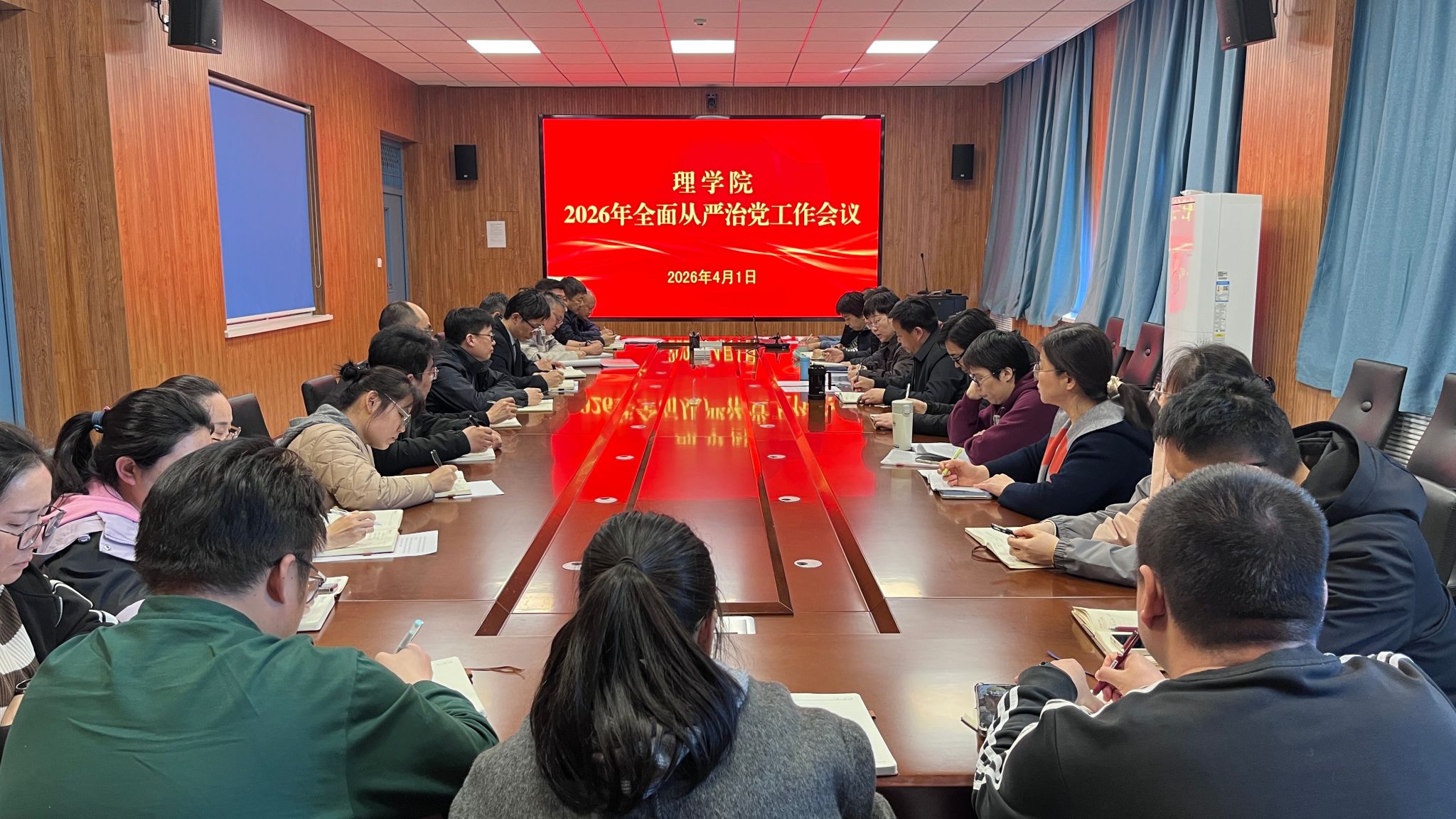4月1日下午,理学院2026年春季学期全面从严治党工作会议在理学楼A301会议室召开。学院领导班子、党委委员、科级干部、系(室)主任、党支部书记参会,会议由学院党委书记刘琳主持。